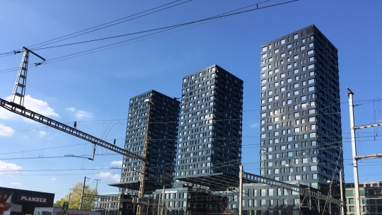 Auf dem ehemaligen BASF-Areal steht ein Hochhaus-Trio von 80 m Höhe Spalier für die in Zürich einfahrenden Züge der SBB. Im gemeinsamen Sockelgeschoss sind ein «a-ja Resort»-Hotel sowie eine Coop-Filiale einquartiert und in den daraus emporragenden Türmen sind 296 Wohnungen untergebracht. Für die Tragwerksplanung zeichneten unsere Mitarbeiter Alexandre Fauchère und Jörg Habenberger verantwortlich.